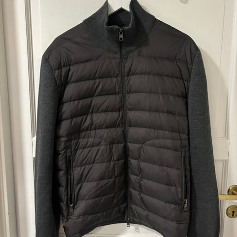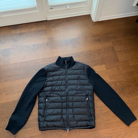 Moncler Jakke i størrelse M, farge blå, laget av dun. Jakken kombinerer dunfyll med strikkede ermer for funksjonell og stilren ytterbekledning for menn.