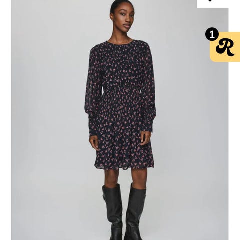 Kjole fra Moods of Norway, pent brukt. Kjolen har lange ermer og en rund hals, flerfarget mønster i mosegrønn, sand og svart.