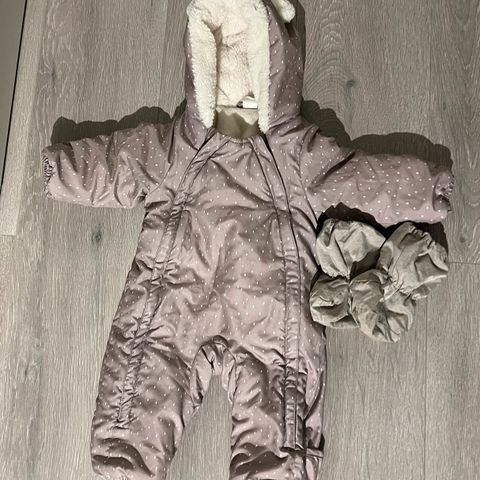 Passer både gutt og jente. Kan kjøpes samlet eller hver for seg: lue og votter – 50 kr, vinterdress – 150 kr, teddydrakt – 150 kr. Tilstand som ny.