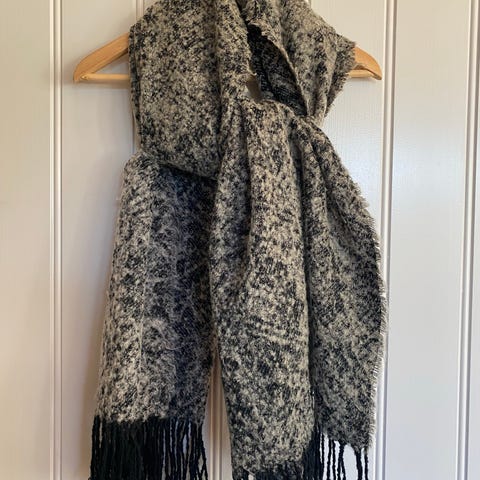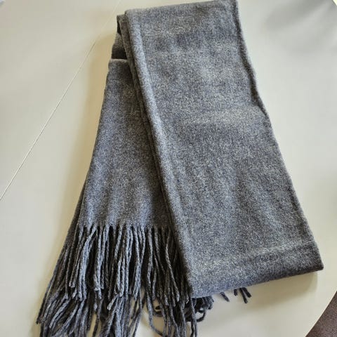 Et pent brukt og stort mørkegrått/mellomgrått skjerf med frynser selges.