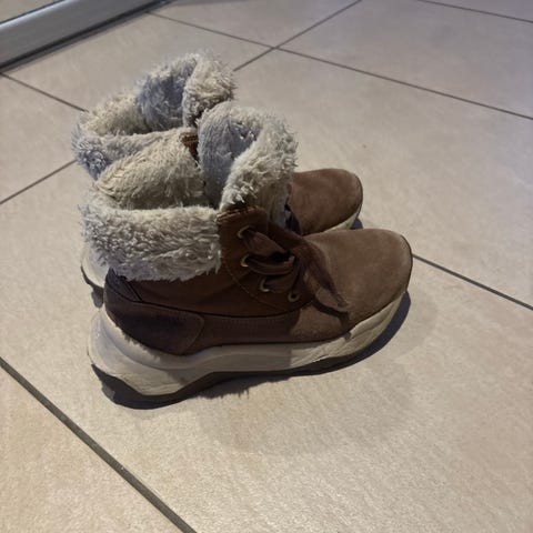Timberland vintersko i størrelse 37, brun farge. Skoene har en varm og myk innside, egnet for kaldere vær. Laget av slitesterkt materiale (ekte skinn) med foring i ull og snøring for god passform.