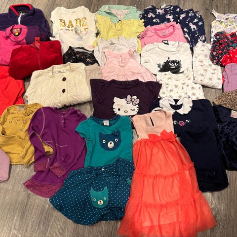 Barneklær i flerfarget design for jente, størrelse 86. Inkluderer strikket jakke og rutete kjole, bukser, genser, 2 pysjamas. Noe klær er str 92, men passer best for 86 str.