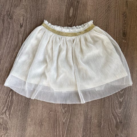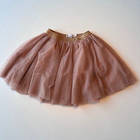 H&M skjørt for barn i størrelse 98/104. Vil si det er beige/gull tyllskjørt med hvitt underskjørt i polyester. Det er glitterdetaljer på skjørtet.