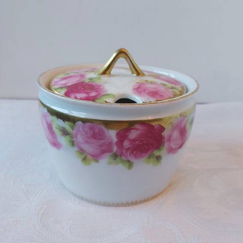Antikk stor avlang skål. Antikkhvit bunnfarge. Dekorert med blomster og gullfarge.