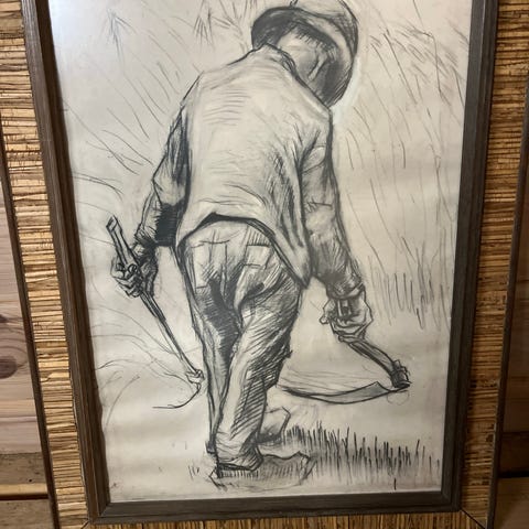Antikk innrammet reprodusert tegning av Van Gogh's "Peasant with Sickle seen from the Back".