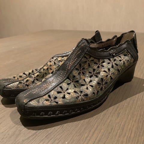 Brukt kun én gang og ser helt nye ut. Sort, semsket skinn. Elastikk på begge sider. Normale i størrelsen og veldig gode på foten.