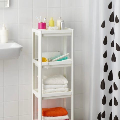 Organisering / oppbevaring for sminke laget av svart plast med flere oppbevaringsrom på toppen og to skuffer.
