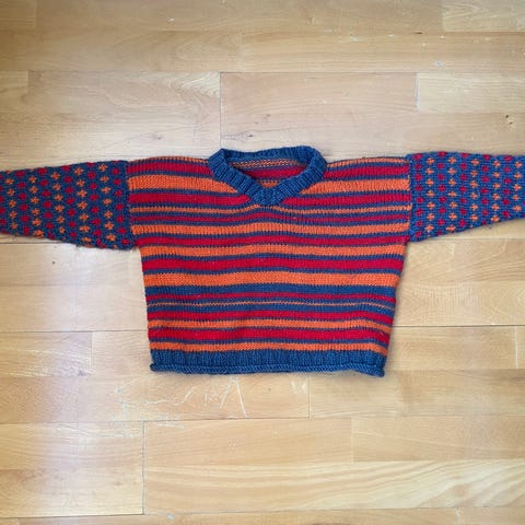 Fin retro hjemmestrikka genser som er i god stand. Passer ca 3-4 år. Rosa hjemmestrikka jakke samme str følger med for samme pris. Kan sende