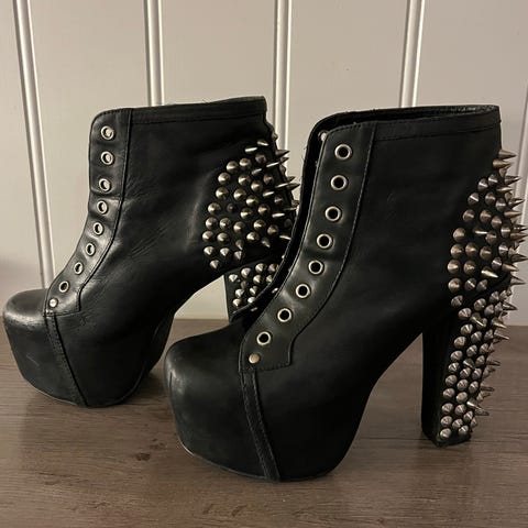 Selger et par fantastiske og helt ubrukte Jeffrey Campbell Walton studded ankelstøvletter i størrelse 40 i metallisk svart skinn. De er litt liten i størrelse. Jeg bruker vanligvis størrelse 39.