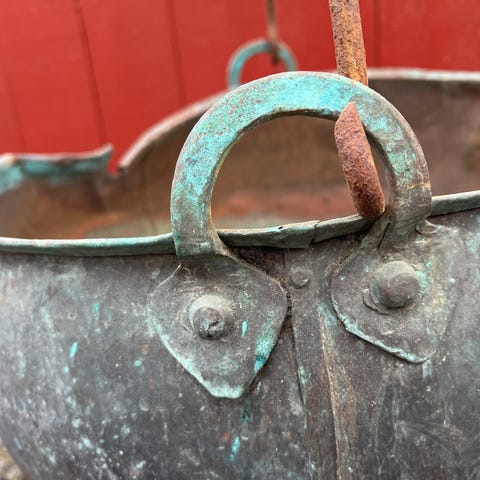Eldre gryte/balje for tøyvask i kobber. diam 60 h40.. dette er en sånn balje man kokte/vasket tøy i for noen år tilbake. Trenger en kjærlig hånd, etter å ha stått ute en stund. Hentes i kristiansand sentrum