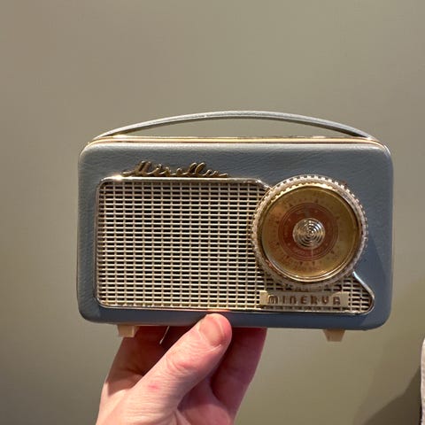 Spilledåse etterligning, av tutgramofon, liten rar sak, må trekkes opp under platen, går rundt når den spiller, tar man tuten til side så stopper den.