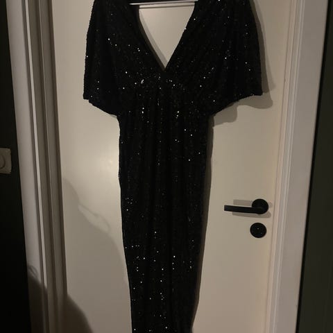 Shein festkjole i størrelse XS. Kjolen er svart og laget med paljetter som dekorerer hele plagget. Designet for kvinner med en skulder og lang arm, egnet til formelle anledninger.
