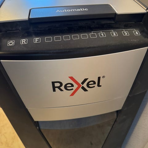 Rexel Momentum X406 makulator for dokumentødeleggelse. Produktet har en svart og sølvfarget design. Brukt få ganger. Noen papir rester i maskinen etter bruk ellers ren og pen.