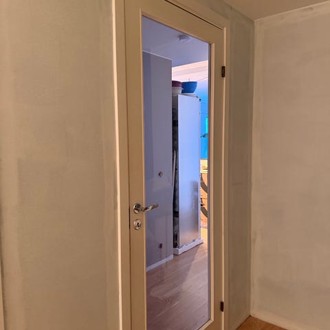 Dør malt i mørk farge med øvre del bestående av farget glass i flere farger. Døren har metallhåndtak og lås. Passer som innerdør eller eventuell ytterdør i beskyttet miljø.90x200 Med karm