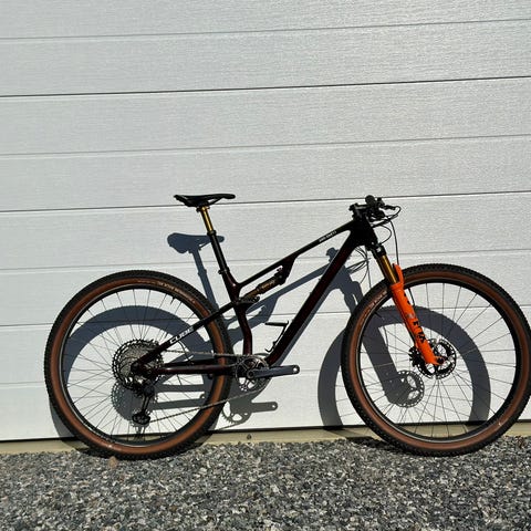 Pent brukt fulldemper fra Orbea selges da jeg nesten bare sykler landevei for tiden. Sykkelen har 29 tommers hjul, 120mm demping fra Fox foran og bak, gode Shimano Deore-bremser og 1x11 gir. Vekt er i område 12-13 kg (Orbea oppgir ikke direkte), men den føles ikke så alt for tung ut synes jeg. Sykkelen er kapabel i terrenget, men relativt god bortover/oppover også, da geometrien og vandringen er mer XC-rettet enn en ren stisykkel. Sykkelen er alltid lagret innendørs og den er lite brukt da jeg har studert borte de siste årene uten mulighet til å ha den med.