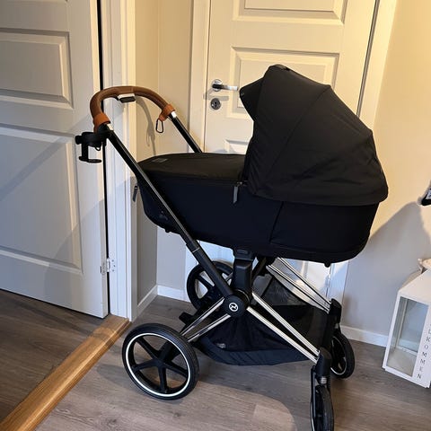 CYBEX Barnevogn i svart farge og rosegull. Designet for barn med justerbar sitteposisjon og sikkerhetssele. Utstyrt med solskjerm og komfortabelt håndtak. Passer for daglig bruk og ulike terreng.
