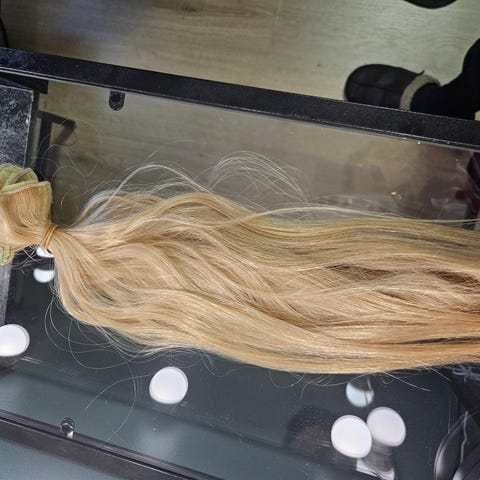 Sett med blond hår extensions i ulike lengder og teksturer. Kan brukes for å forlenge og gi volum til naturlig hår. Passer for personer som ønsker ekstra lengde eller fylde. Til aller dager eller festen. Helt naturlig dame hår. Kan farges i åndelig farge, krøller eller glatte.. har 50cm