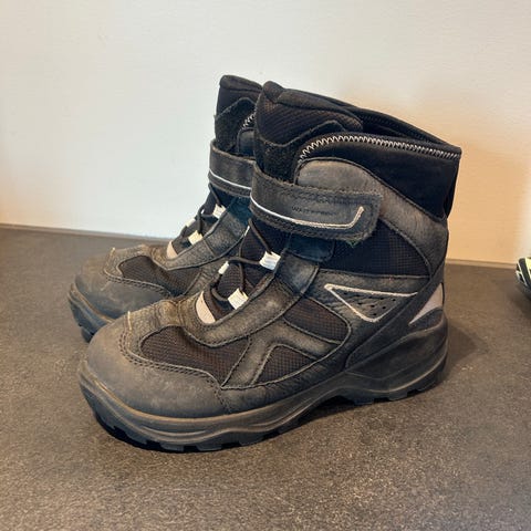 ECCO Jente sko i størrelse 34. Skoene har en kombinasjon av materialer med en fargepalett i nyanser av grå og svart. De er designet med borrelås og snøring for enkel tilpasning og god passform. Sålen har et mønster som gir godt grep.