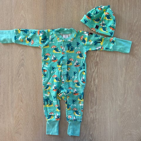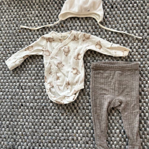 Polarn O. Pyret sett, grå farge, laget av bomull. Passer for både gutter og jenter. Settet inkluderer body, bukse og lue. Body i str. 62, bukse i 68 og lue i 44/46