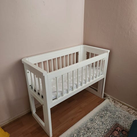 Selger en nydelig hvit bedsidecrib. Denne har vært redningen de første månedene. Den ene sidevangen kan heises opp og ned for å kunne ha babysengen helt inntil egen seng. Den er også en god del mindre enn en ordinær babyseng, og føles tryggere og mer intim. Fremstår meget pen med unntak av et lite merke på den ene siden (kan sikkert gjøres noe med så det ikke synes). Utvendige mål: 45 x 95, h: 86. Har hjul så den er lett å flytte på, hjulene kan også låses så den står trygt i ro. Må hentes i Sarpsborg.