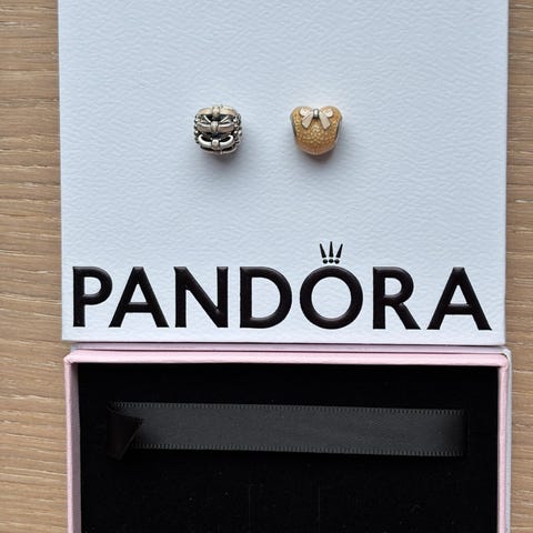 3 charms Pandora i sølv 925 med Murano glass. Selges samlet. En charm har skade, men det er knapt synlig. Kan sendes som postbrev for 35 kr