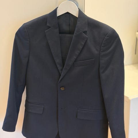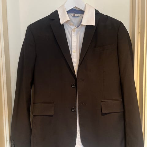 Pent brukt blazer og skjorte. Buksen har fått et lite merke under høyre kne og litt sliten i buksebeina. Buksen kan justeres i livet.