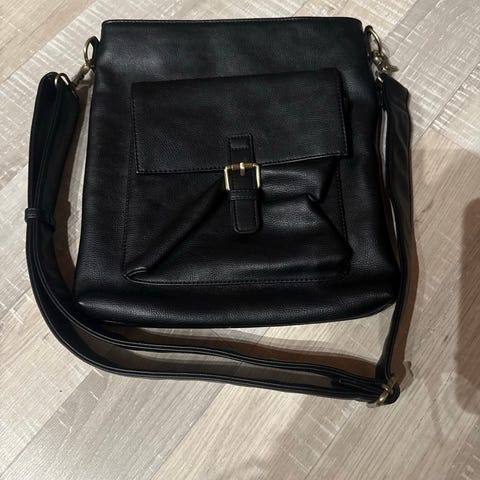 Sort, lett skulderveske i størrelse bredde 32 og høyde 30 cm. Følger med to skulderstropper i ulike lengder. Mener merke er Lycke. Pent brukt, uten bruksmerker. Stoff nylon.