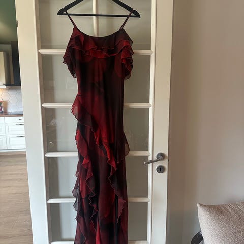 Vila festkjole i størrelse 38 for dame. Kjolen er laget av polyester og har en dyp burgunder rød farge. Passer til formelle anledninger og fester.