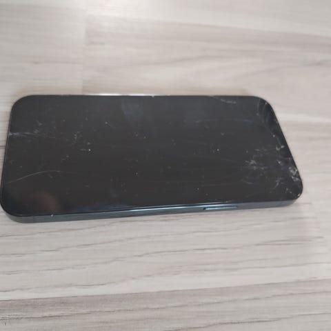Apple iPhone 12 mobiltelefon med 128 GB lagringskapasitet. Enheten har blå farge, knust på baksiden av telefonen og kan bare lades med trådløs powerbank