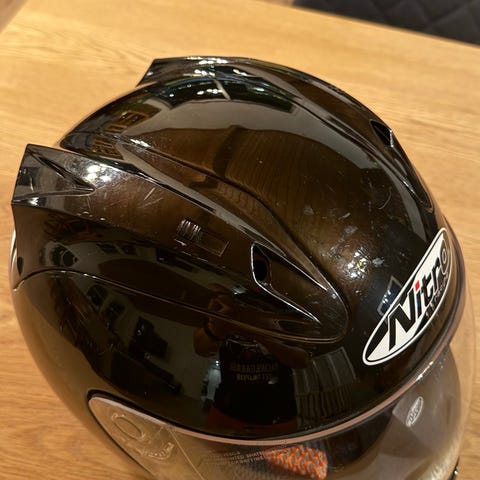 . Hjelmen er designet for motorsykkelbruk med full ansiktsbeskyttelse. Den har polstret innside for komfort og sikkerhet. For skjermen på hjelmen er litt knekt men ellers helt fin stand