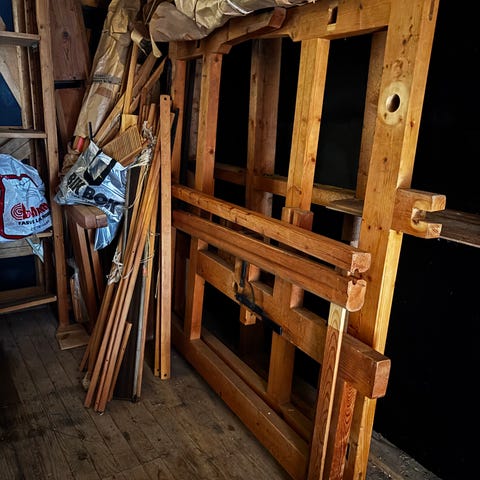 Vevstol med noen esker ferdig revet og nøstet mattefiller.