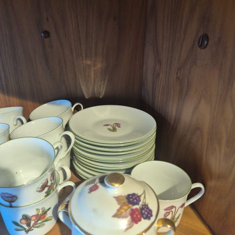 Hutchenrauthen Germany 1814 er stempelet under! Nydelig beskjedent mønster i grått på hvitt porselen- 6 kopper skål og asjetter samt fløtemugge og sukkerskål!