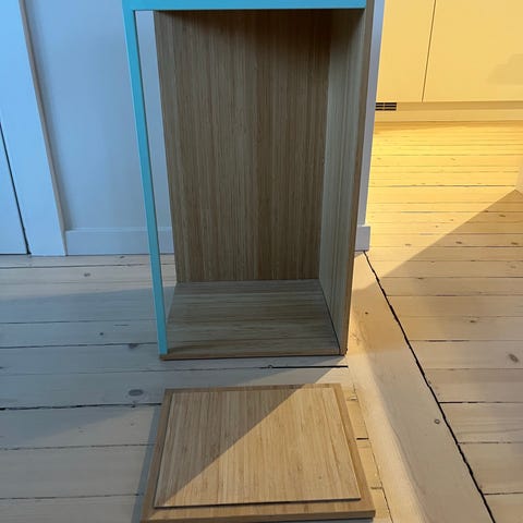 Hyllen har ingen merker eller skader. Den en ment til å henges på vegg. Den veier litt men jeg har klart å henge den på gipsveggen med gipsskruer uten noen problemer.