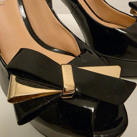 Skoene har spiss tå, høy hæl og elegant design med den ikoniske gullfargede padlock-detaljen bak. Kjøpt i Dubai Mall.