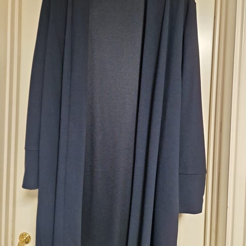 Blazer jakke for dame i størrelse XL. Jakken er blå og har et løst, rett snitt med lange ermer. Åpen front uten lukking og store lommer foran. Egnet som lett ytterjakke eller lag-på-lag-plagg til hverdagsbruk.