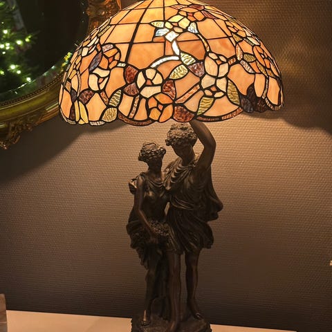 Tiffanylampe, Tiffany bordlampe, vintage Tiffany lampe, blyglass lampe, glasslampe, Art Nouveau lampe, jugendstil lampe, dekorlampe, stemningslampe, nattbordlampe, retro lampe, farget glass, håndlaget lampe, klassisk lampe, interiørlampe, blomsterlampe, julelampe, misteltein, juleklokke