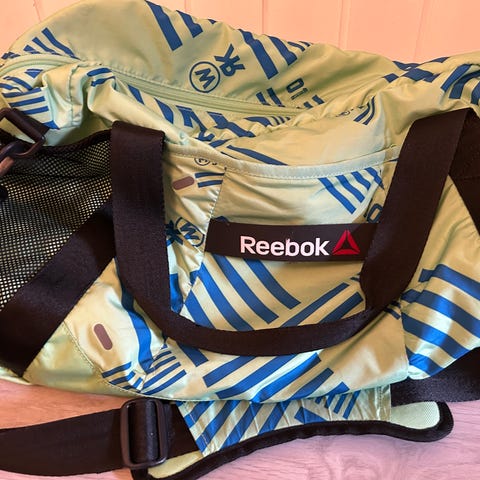 Reebok stoff veske designet for unisex bruk. Vesken har et romslig hovedrom med glidelås og flere innvendige lommer for organisering. Materialet er slitesterkt stoff med et mønster i mørke farger, og håndtak i svart stoff for enkel bæring.
