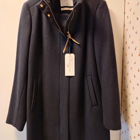 En veldig pen og elegant damefrakk i mørkeblå. Den passer en størrelse S. Den er brukt omtrent tre ganger på det meste. Den ser mer attraktiv ut i virkeligheten.