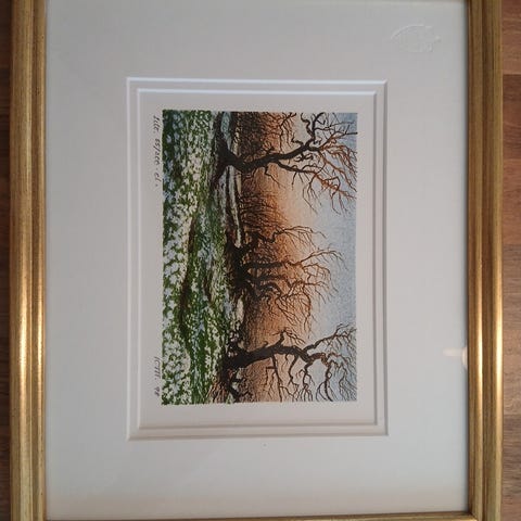 Litografi av Kjell Thorjussen nr. 156/250 fra 1995. Ytre mål 21x19 cm. Signert littografi fra 1995 som viser et landskap med en rød hytte, trær og fjell i bakgrunnen. Trykket er nummerert 156/250 og er innrammet med en gyllen ramme. Motivet har en dempet fargepalett med grønt, brunt og blått. Selve litografiet har mål 11x8 cm.