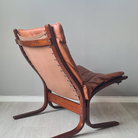 Skinnet er godt ivaretatt og ellers er stolen i god stand (har en liten rift i stoffet på baksiden av stolryggen, men den er ikke av betydning).