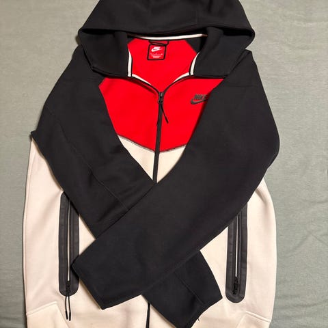 Nike techfleecehettegenser fargen er svart, rød og hvit.