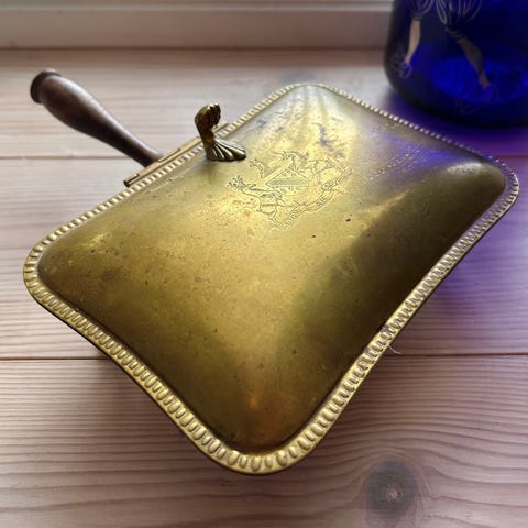 Vakkert vintage smulebrett i messing med treskaft. Lokket er dekorert med et gravert britisk våpenskjold og mottoet “MAJOR AB ADVERSIS”.