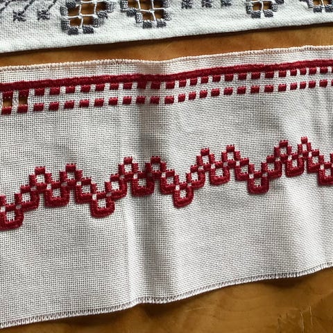 Dekorativ og flott brettholder med kantbånd i klar, dyp rødfarge. Tettvevet lin.