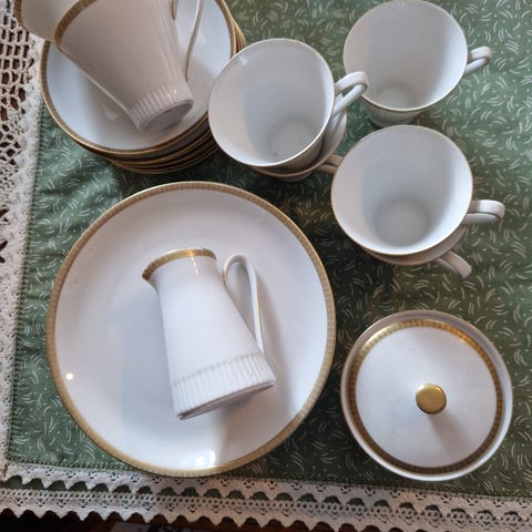 12 kopper og tefat, 11 asjetter, 1 sukkerskål og 1 mugge
