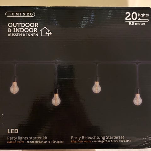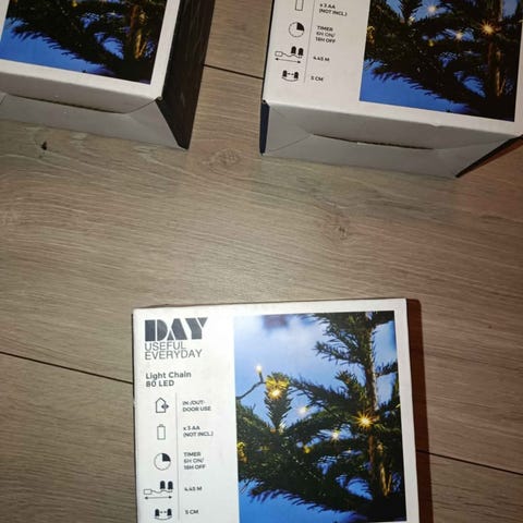 Ubrukte lys, men ble hengt opp og tatt ned igjen da det ikke ble helt riktig farge for meg. To pakker med 3 m, og en med 4.5 m. Mangler den ene esken til den ene 3 m lenka, for var helt sikker på det var riktig før jeg skrudde på lyset 😅