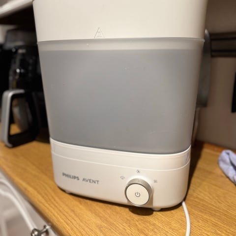 Philips Avent Dampsterilisator i hvit farge. Designet for effektiv sterilisering av babyflasker og tilbehør. Enheten har et brukervennlig kontrollpanel og et gjennomtenkt design for enkel bruk og rengjøring.