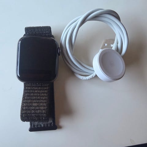 Apple Watch Series 4 smartklokke med 45 mm aluminiumsramme. Klokken har flere utskiftbare remmer i forskjellige farger og materialer. Batterikapasiteten er målt til 75 %. Passer for brukere som ønsker en smartklokke med helse- og aktivitetsfunksjoner. Alt fungerer utmerket. Følger med lader.