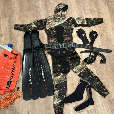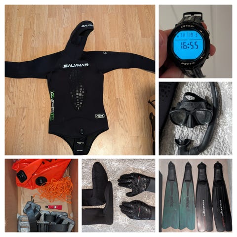 Jeg har holdt på med fridykking i mange år, og fridykkerboda har etterhvert blitt veldig full av fint utstyr i ulike størrelser beregnet for norske forhold.