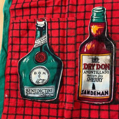 Blått forkle med noe rødt. Kan også sendes.