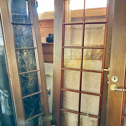 Innvendig dør eikefiner, 89 x 205, med glassfelt og ramme i tre. Døren har dekorative blyglassruter med metallinnramming og et messingfarget håndtak.